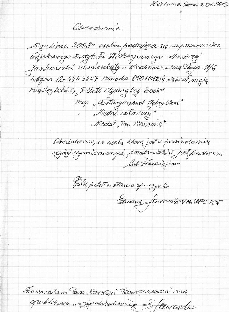 | Oświadczenie ppłka pil. Edwarda Jaworskiego VM,DFC,KW | |||||||